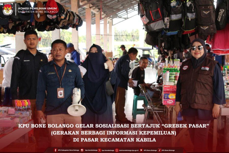 #TemanPemilih, KPU Kabupaten Bone Bolango menggelar sosialisasi bertajuk Grebek Pasar: Gerakan Berbagi Informasi Kepemiluan di Pasar Kecamatan Kabila, Selasa (10/02/2026). Kegiatan ini menjadi bagian dari upaya KPU dalam mendekatkan informasi kepemiluan kepada masyarakat secara langsung.. Sosialisasi dipimpin oleh Ketua KPU Kabupaten Bone Bolango, Sutenty Lamuhu, bersama Anggota KPU Idris Djou, didampingi jajaran Sekretariat KPU. Dalam kegiatan tersebut, KPU menyampaikan berbagai informasi penting terkait Pemutakhiran Data Pemilih Berkelanjutan (PDPB). Masyarakat diberikan pemahaman mengenai pentingnya memastikan diri telah terdaftar sebagai pemilih, memperbarui data jika terjadi perubahan identitas atau domisili, serta melaporkan jika terdapat data pemilih yang tidak lagi memenuhi syarat. KPU Bone Bolango menyasar pasar karena pasar merupakan salah satu tempat strategis untuk menjangkau masyarakat luas. Melalui Grebek Pasar, KPU berharap informasi kepemiluan dapat diterima langsung oleh masyarakat sehingga kesadaran akan pentingnya data pemilih yang akurat semakin meningkat. #KPUMelayani ....