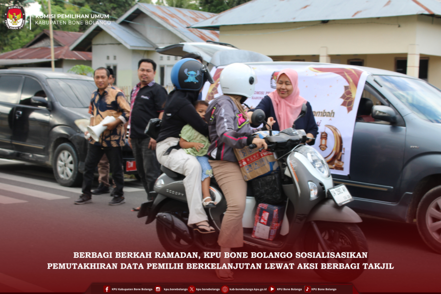 #TemanPemilih, Komisi Pemilihan Umum Kabupaten Bone Bolango menggelar kegiatan berbagi takjil kepada masyarakat sebagai wujud kepedulian di bulan suci Ramadan. Kegiatan ini tidak hanya menjadi momentum berbagi, tetapi juga dimanfaatkan untuk menyampaikan informasi kepemiluan kepada masyarakat, Jum'at 27/02/2026. Ketua dan Anggota KPU Kabupaten Bone Bolango didampingi jajaran sekretariat turun langsung membagikan takjil kepada para pengguna jalan dan warga sekitar. Menariknya, kegiatan berbagi takjil ini juga dikemas dengan penyampaian informasi terkait Pemutakhiran Data Pemilih Berkelanjutan (PDPB) melalui leaflet berisikan yang dibagikan bersamaan dengan pembagian takjil. Ketua KPU Kabupaten Bone Bolango menyampaikan bahwa kegiatan ini merupakan bentuk komitmen KPU dalam mendekatkan diri kepada masyarakat, sekaligus memastikan informasi kepemiluan tersampaikan secara luas dengan cara yang humanis. #KPUMelayani ....