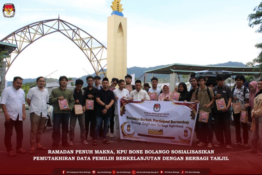 #TemanPemilih, Dalam semangat berbagi di bulan suci Ramadan, KPU Kabupaten Bone Bolango melaksanakan kegiatan “KPU Berbagi Takjil dan Berbagi Informasi” kepada masyarakat pada Jumat (06/03/2026). Ketua dan Anggota KPU Bone Bolango yang didampingi jajaran sekretariat turun langsung membagikan takjil kepada masyarakat. Tidak hanya berbagi makanan berbuka puasa, KPU juga membagikan leaflet berisi informasi kepemiluan, khususnya terkait Pemutakhiran Data Pemilih Berkelanjutan (PDPB). Melalui kegiatan ini, masyarakat diajak untuk ikut berperan aktif memastikan data pemilih tetap akurat dengan melaporkan perubahan data seperti pemilih meninggal dunia, pindah domisili, menjadi anggota TNI/Polri, pemilih pemula, maupun perbaikan data pemilih. Semoga kegiatan ini membawa keberkahan Ramadan sekaligus meningkatkan kesadaran masyarakat akan pentingnya data pemilih yang akurat demi demokrasi yang lebih baik. #KPUMelayani ....
