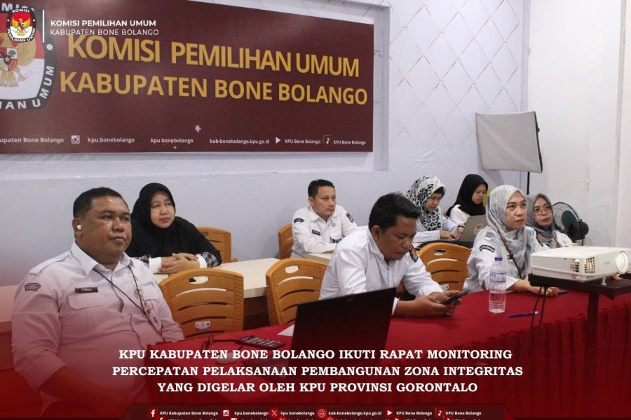 KPU Kabupaten Bone Bolango mengikuti Rapat Monitoring Percepatan Pelaksanaan Pembangunan Zona Integritas yang digelar oleh KPU Provinsi Gorontalo, Senin (03/11/2025) secara daring melalui Aula KPU Bone Bolango.