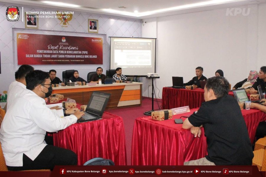 KPU Kabupaten Bone Bolango menggelar Rapat Koordinasi Pemutakhiran Data Pemilih Berkelanjutan (PDPB) sebagai tindak lanjut atas saran perbaikan yang disampaikan oleh Bawaslu Bone Bolango. Rabu 19/11/2025, Rapat yang berlangsung di kantor KPU Bone Bolango ini turut dihadiri oleh Bawaslu Bone Bolango dan Dinas Dukcapil Bone Bolango sebagai bentuk penguatan koordinasi lintas lembaga dalam memastikan akurasi data pemilih.