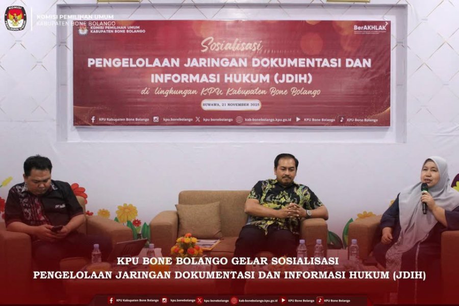 (KPU) Kabupaten Bone Bolango gelar kegiatan Sosialisasi Pengelolaan Jaringan Dokumentasi dan Informasi Hukum (JDIH) di Aula Kantor KPU Bone Bolango, Jum’at (21/11/2025). Kegiatan ini dihadiri oleh Ketua dan Anggota KPU Bone Bolango, Kepala Kejaksaan Negeri Bone Bolango, serta mahasiswa Fakultas Hukum Universitas Negeri Gorontalo (UNG) yang menjadi peserta dalam kegiatan sosialisasi tersebut.