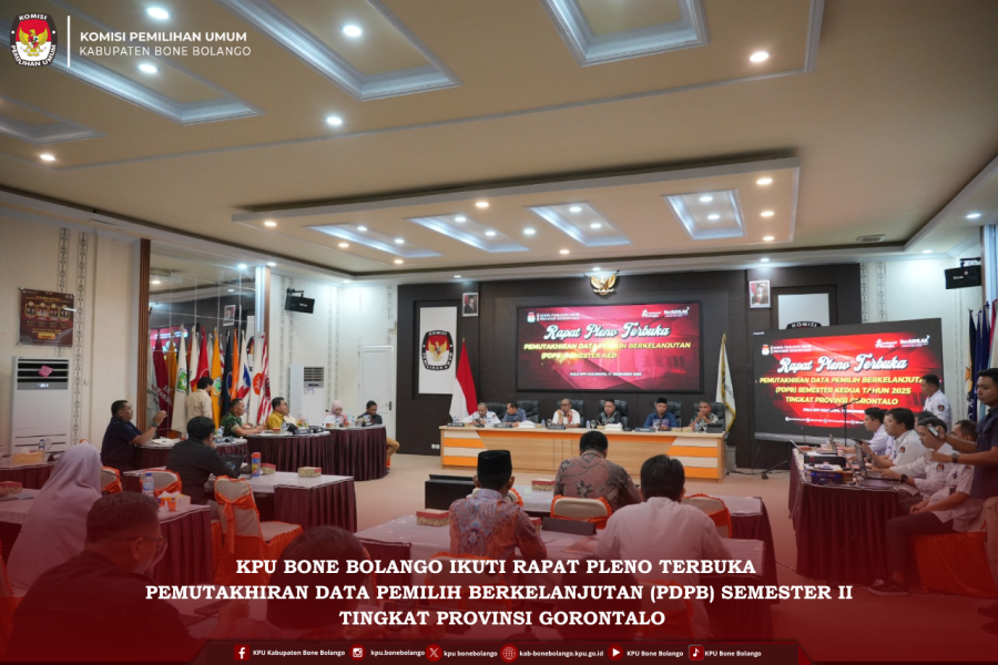 Ketua KPU Kabupaten Bone Bolango Sutenty Lamuhu dan Anggota KPU Kabupaten Bone Bolango Divisi Perencanaan Data dan Informasi Adnan A. Berahim yang didampingi Kasubbag Rendatin serta Operator Sidalih KPU Kab. Bone Bolango menghadiri Rapat Pleno Terbuka Rekapitulasi Pemutakhiran Data Pemilih Berkelanjutan (PDPB) Semester II Tahun 2025 Tingkat Provinsi Gorontalo yang digelar KPU Provinsi Gorontalo pada Kamis (11/12/2025) di Aula KPU Provinsi.