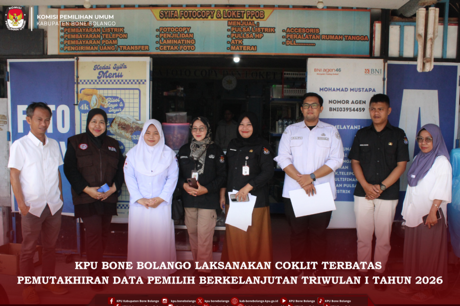 Komisi Pemilihan Umum (KPU) Kabupaten Bone Bolango melaksanakan kegiatan Pencocokan dan Penelitian (Coklit) Terbatas dalam rangka Pemutakhiran Data Pemilih Berkelanjutan Triwulan I Tahun 2026. Kegiatan ini dilaksanakan selama dua hari, yakni pada 11 hingga 12 Maret 2026, sebagai bagian dari upaya memastikan data pemilih tetap akurat, mutakhir, dan dapat dipertanggungjawabkan.