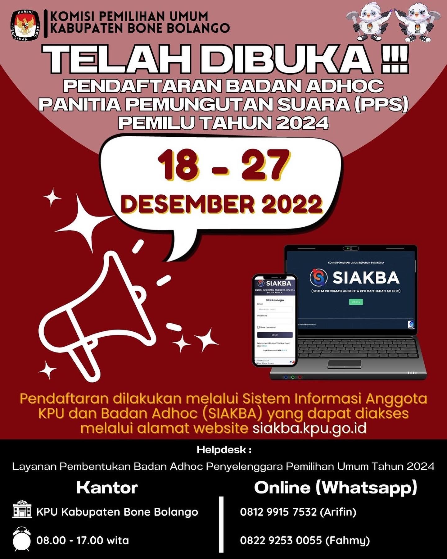 Berdasarkan pada Berita Acara Komisi Pemilihan Umum Kabupaten Bone Bolango Nomor : 92/PL.01.3-BA/7503/2022 tentang Penetapan Rancangan Penataan Daerah Pemilihan dan Alokasi Kursi Anggota Dewan Perwakilan Rakyat Daerah Kabupaten/Kota dalam Pemilihan Umum Tahun 2024, dengan ini mengumumkan Rancangan Penataan Daerah Pemilihan dan Alokasi Kursi Anggota Dewan Perwakilan Rakyat Daerah Kabupaten Bone Bolango dalam Pemilihan Umum Tahun 2024 untuk mendapatkan masukan dan tanggapan masyarakat sebagaimana tercantum dalam lampiran pengumuman ini.