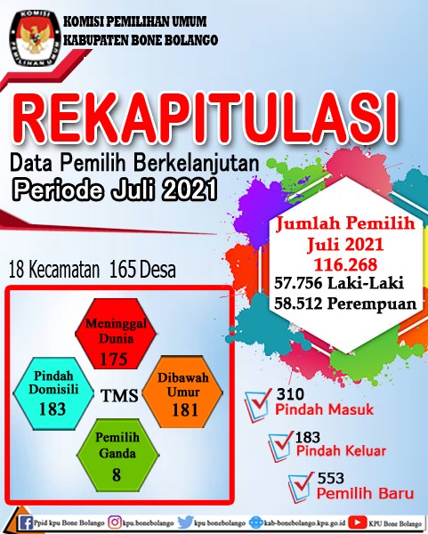 KPU Bone Bolango – Berdasarkan Surat Ketua KPU RI NOMOR :366/PL.02-SD/01/KPU/IV/2021 TANGGAL 21 April 2021 Perihal Perubahan Surat Ketua KPU RI NOMOR :132/PL.02-SD/01/KPU/II/2021 Perihal Pemutakhiran Data Pemilih Berkelanjutan Tahun 2021. Maka dengan ini disampaikan pengumuman data pemilih perubahan, kabupaten Bone Bolango bulan Juli tahun 2021 dan lampiran daftar perubahan pemilih hasil PDPB bisa langsung  di klik di alamat ini https://bit.ly/PDPB_JULI_2021 atau bisa di unduh di bawah ini DPB_JULI REKAP-A.1-DPB_JULI #KPUMelayani #LDR(Lapordarirumah) #Ilegeliyong