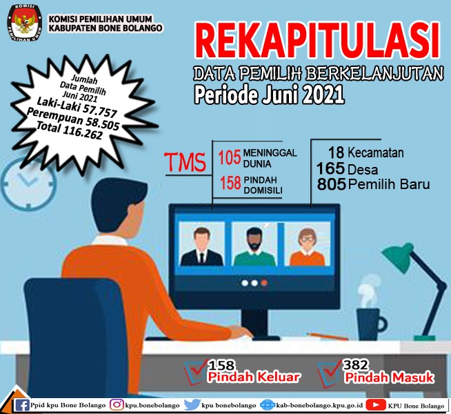 #Temanpemilih Berdasarkan Surat Ketua KPU RI NOMOR :366/PL.02-SD/01/KPU/IV/2021 TANGGAL 21 April 2021 Perihal Perubahan Surat Ketua KPU RI NOMOR :132/PL.02-SD/01/KPU/II/2021 Perihal Pemutakhiran Data Pemilih Berkelanjutan Tahun 2021. Maka dengan ini disampaikan pengumuman data pemilih perubahan, kabupaten Bone Bolango bulan Juni tahun 2021 dan lampiran daftar perubahan pemilih hasil PDPB bisa langsung kunjungi web site resmi KPU Kabupaten Bone {kab-bonebolango.kpu.go.id} atau di klik di alamat ini http://bit.ly/PDPB_JUNI_2021  silahkan clik link dibawah ini Rekap PDPB Periode Bulan Juni 2021 Byname A-PDPBJuni 2021 #KPUMelayani #LDR(Lapordarirumah) #Ilegeliyongo