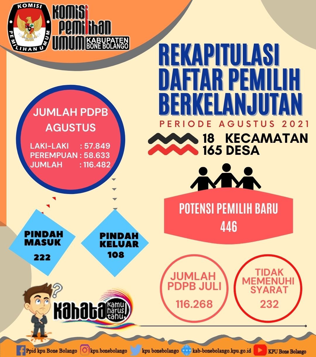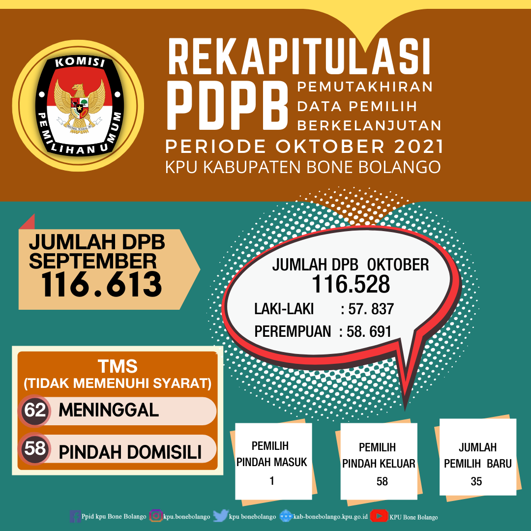 KPU Bone Bolango. Berdasarkan Surat Ketua KPU RI NOMOR :366/PL.02-SD/01/KPU/IV/2021 TANGGAL 21 April 2021 Perihal Perubahan Surat Ketua KPU RI NOMOR :132/PL.02-SD/01/KPU/II/2021 Perihal Pemutakhiran Data Pemilih Berkelanjutan Tahun 2021. Maka dengan ini disampaikan pengumuman data pemilih perubahan, kabupaten Bone Bolango bulan Oktober  tahun 2021 dan lampiran daftar perubahan pemilih hasil PDPB bisa langsung kunjungi web site resmi KPU Kabupaten Bone {kab-bonebolango.kpu.go.id} atau di klik di alamat ini https://bit.ly/PDPB_OKTOBER_2021 A-DPB_OKTOBER 2021 REKAP A.1-DPB_OKTOBER 2021   #KPUMelayani #LDR(Lapordarirumah) #Ilegeliyongo