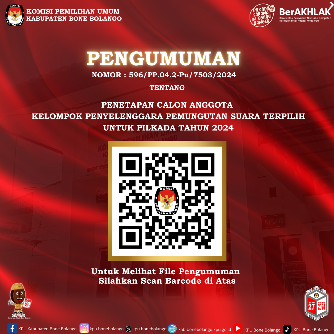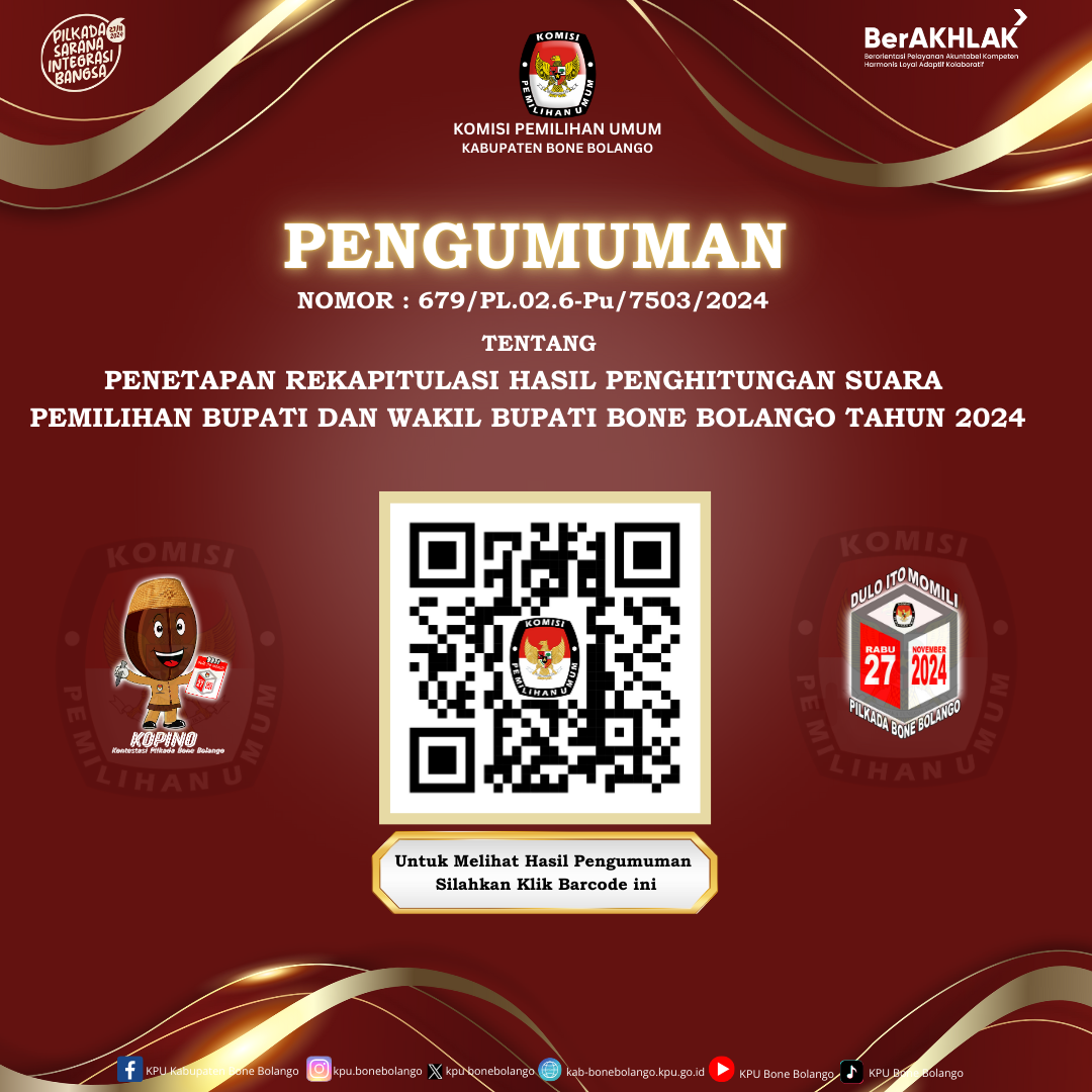 PENGUMUMAN NOMOR 679/PL.02.6-Pu/7503/2024 TENTANG PENETAPAN REKAPITULASI HASIL PENGHITUNGAN SUARA PEMILIHAN BUPATI DAN WAKIL BUPATI BONE BOLANGO TAHUN 2024.