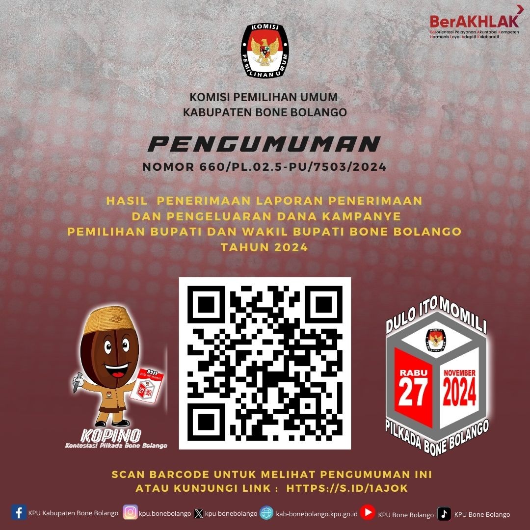 PENGUMUMAN NOMOR : 660/PL.02.5-PU/7503/2024 TENTANG HASIL PENERIMAAN LAPORAN PENERIMAAN DAN PENGELUARAN DANA KAMPANYE PEMILIHAN BUPATI DAN WAKIL BUPATI BONE BOLANGO TAHUN 2024