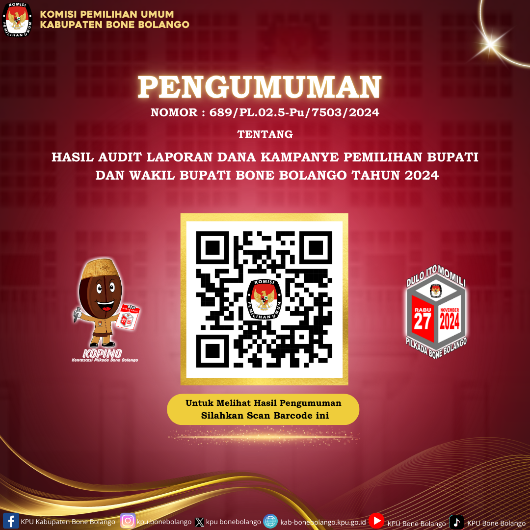 PENGUMUMAN NOMOR : 689/PL.02.5-Pu/7503/2024 TENTANG HASIL AUDIT LAPORAN DANA KAMPANYE PEMILIHAN BUPATI DAN WAKIL BUPATI BONE BOLANGO TAHUN 2024.