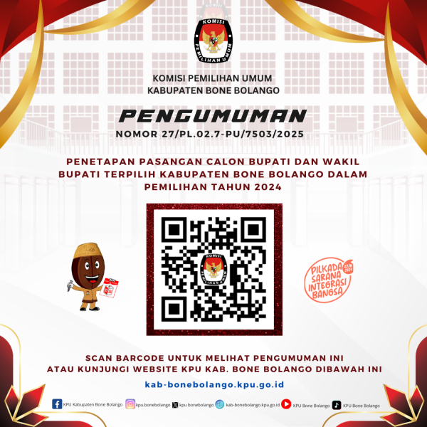 Berikut ini Pengumuman no 27/PL.02.7-Pu/7503/2025 tentang Penetapan Pasangan Calon Bupati dan Wakil Bupati Terpilih Kabupaten Bone Bolango dalam Pemilihan Tahun 2024.