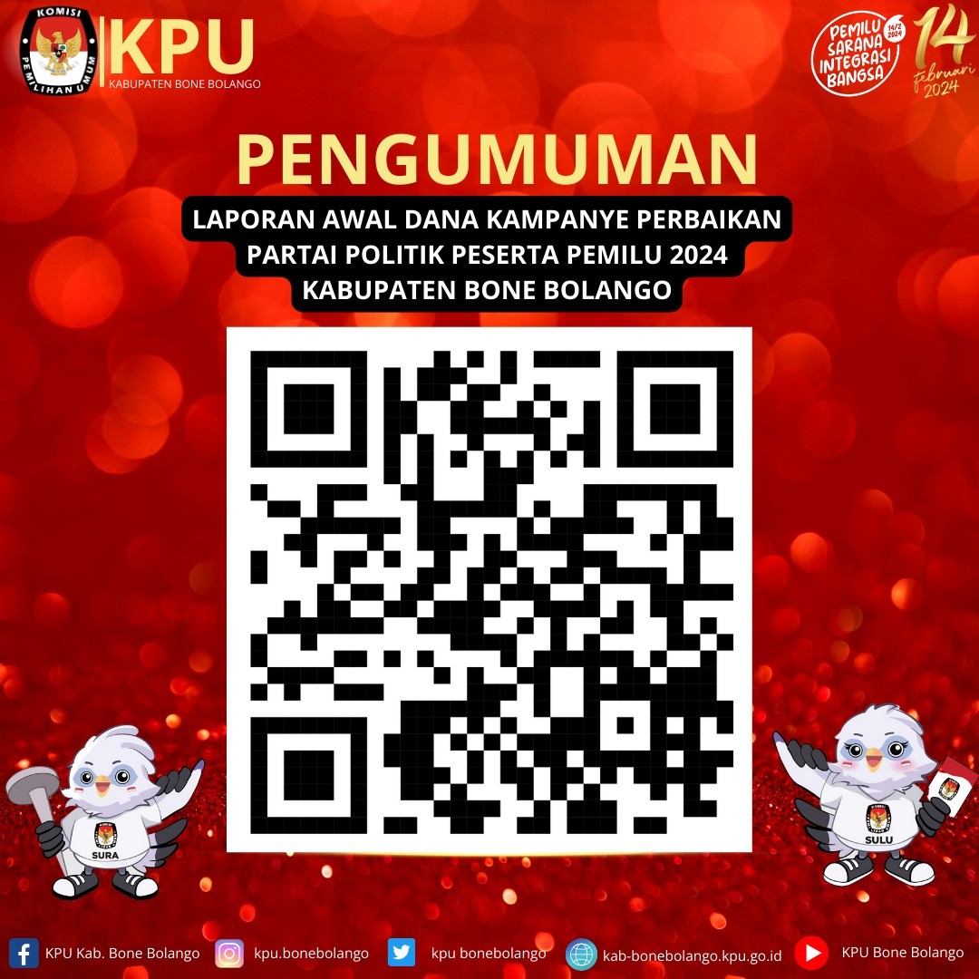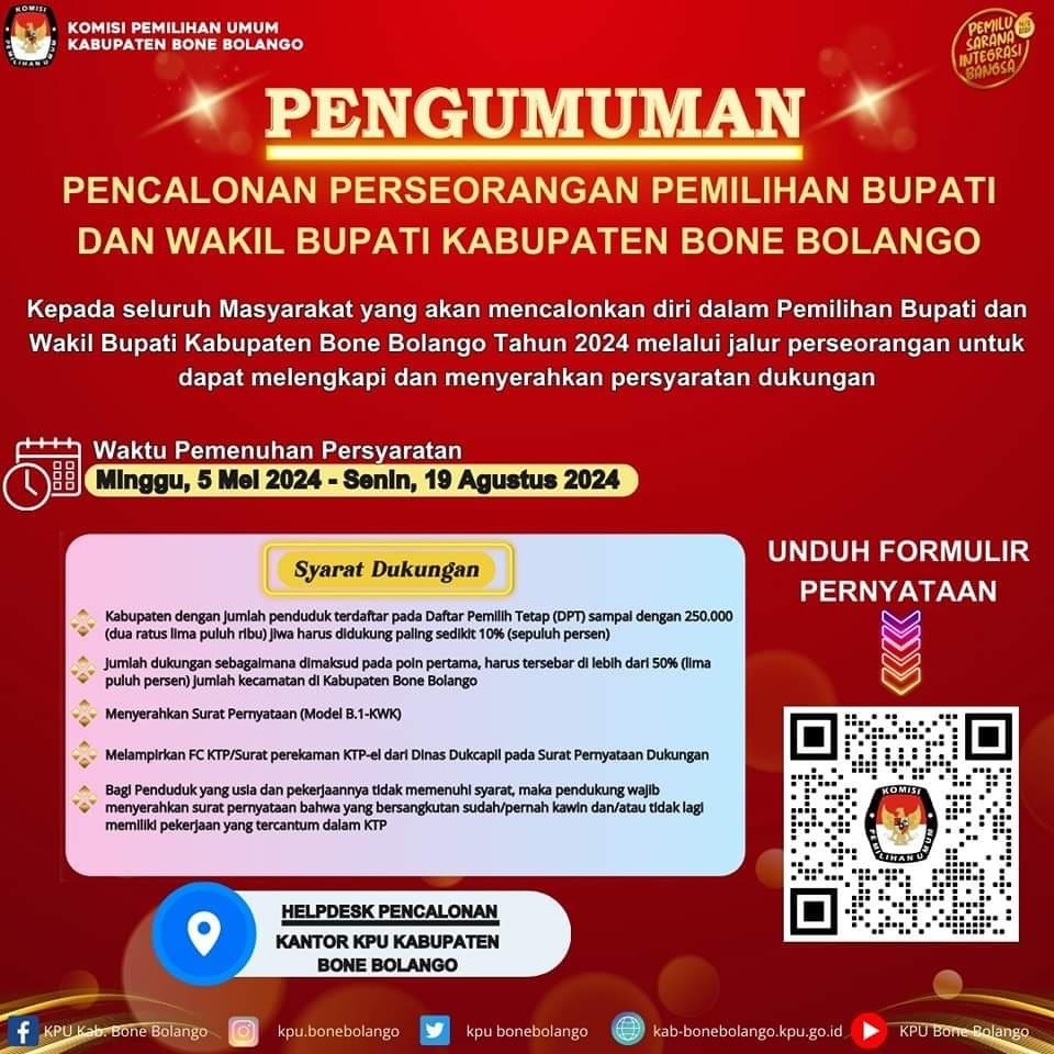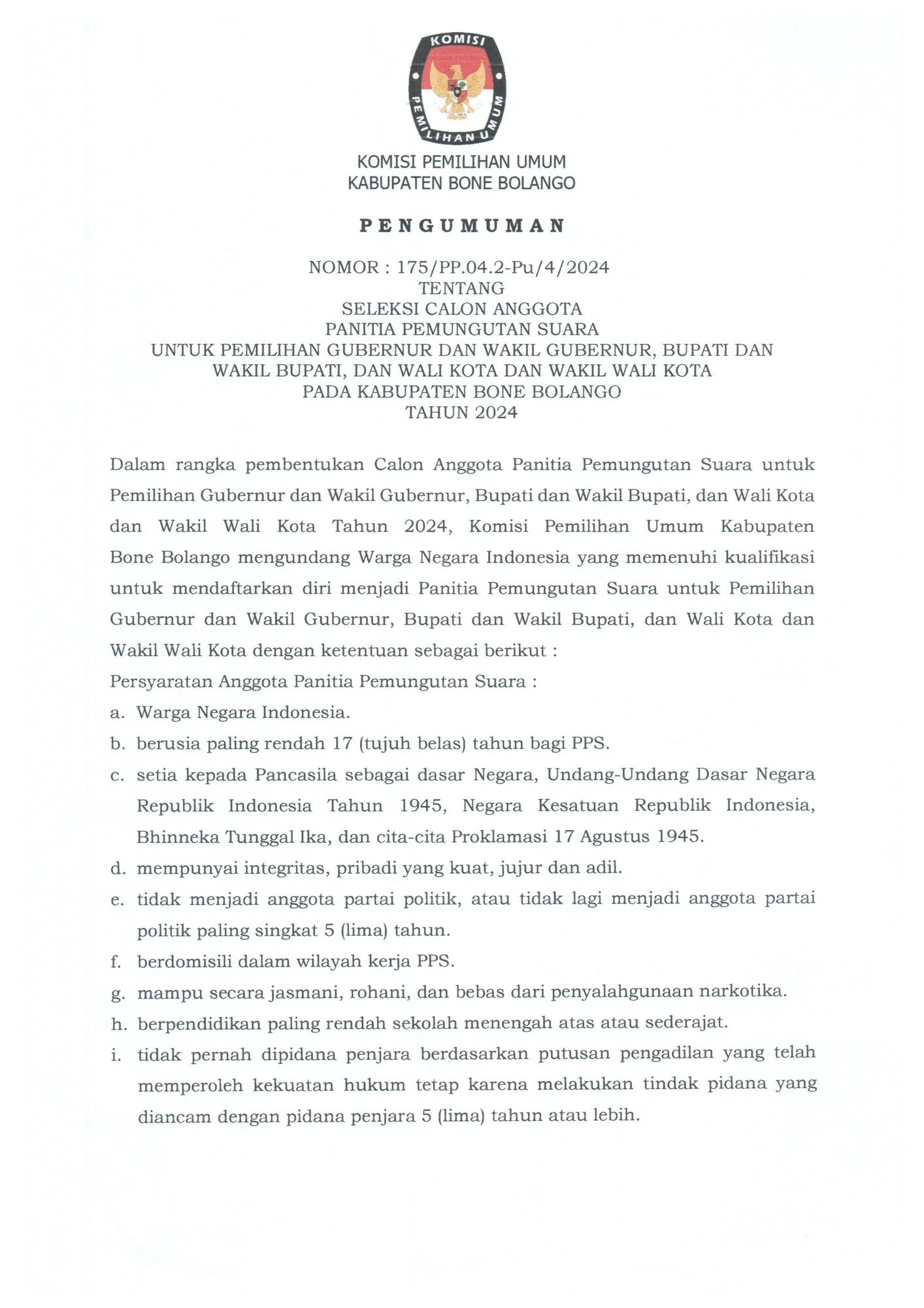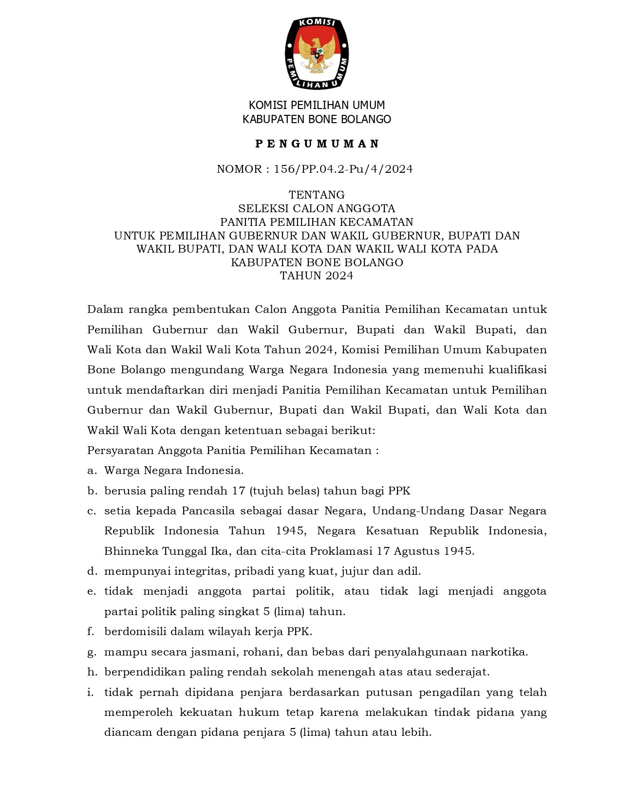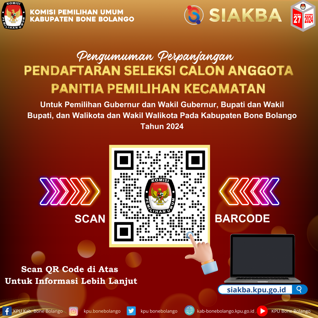 PENGUMUMAN PERPANJANGAN PENDAFTARAN CALON ANGGOTA PPK UNTUK PEMILIHAN GUBERNUR DAN WAKIL GUBERNUR, BUPATI DAN WAKIL BUPATI, DAN WALI KOTA DAN WAKIL WALI KOTA PADA KABUPATEN BONE BOLANGO TAHUN 2024 Berdasarkan Keputusan Ketua Komisi Pemilihan Umum Nomor 476 Tahun 2022 tentang Pedoman Teknis Pembentukan Badan Adhoc Penyelenggara Pemilihan Umum dan Pemilihan Gubernur dan Wakil Gubernur Bupati dan Wakil Bupati dan Walikota dan Wakil Walikota, menyampaikan bahwa perpanjangan pendaftaran dilakukan dalam hal sampai dengan masa pendaftaran berakhir tidak ada peserta yang mendaftar atau kurang dari 2 (dua) kali jumlah PPK yang dibutuhkan, membuka 1 (satu) kali perpanjangan waktu pendaftaran selama 3 (tiga) Hari. Sehubungan dengan hal tersebut, KPU Kabupaten Bone Bolango, membuka perpanjangan waktu pendaftaran seleksi calon anggota PPK sejak tanggal 30 April 2024 sampai dengan tanggal 2 Mei 2024 pada Kecamatan sebagai berikut : 1. Kecamatan Suwawa Selatan; 2. Kecamatan Suwawa Tengah; 3. Kecamatan Suwawa Timur; 4. Kecamatan Pinogu; 5. Kecamatan Bone; 6. Kecamatan Botupingge; 7. Kecamatan Tapa; 8. Kecamatan Bulango Timur; dan 9. Kecamatan Bulango Utara. Untuk Info lengkap, silahkan Klik DISINI